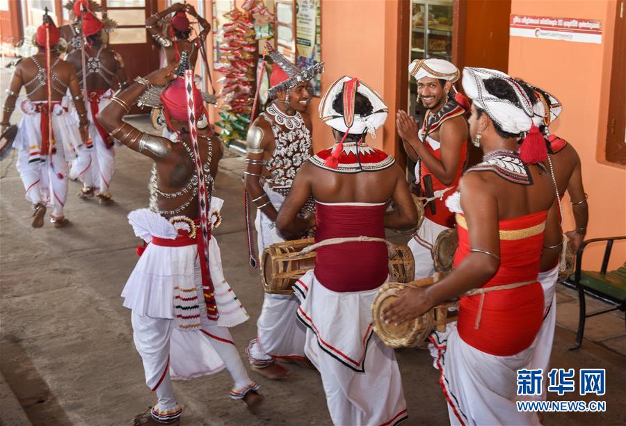 4月8日,在斯里兰卡南部马特勒车站,当地人着盛装,表演传统歌舞,庆祝斯南部铁路延长线一期项目通车。 由中国企业承建的斯里兰卡南部铁路延长线一期项目8日正式通车,并在斯南部城市贝利亚塔举行了通车仪式。 新华社记者 郭磊 摄