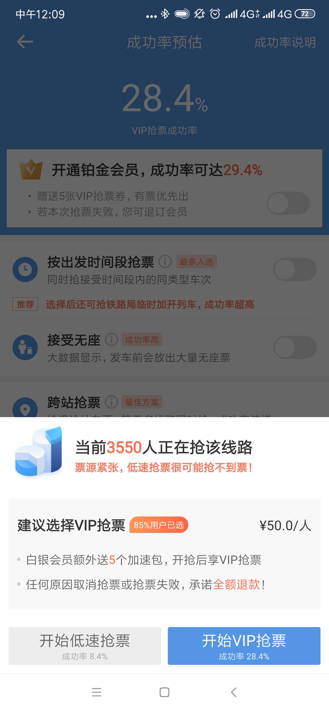 点击低速抢票按钮后出现第二次确认的界面 图片截自智行火车票APP