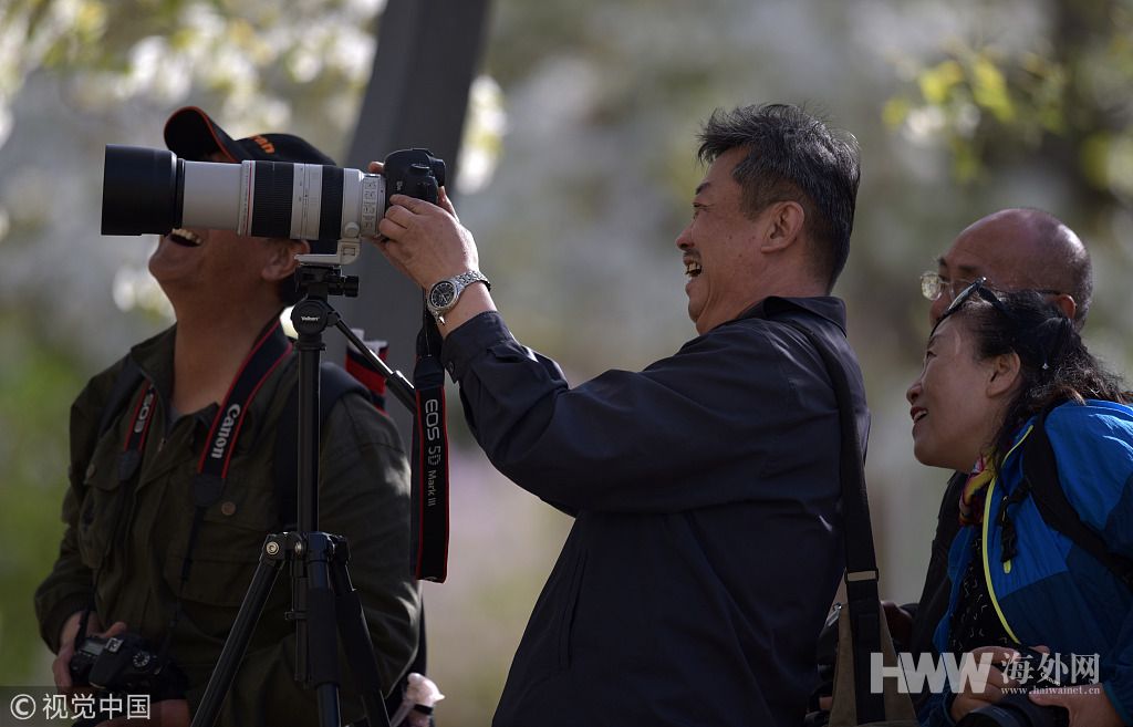 2019年4月9日,摄影爱好者在新疆库尔勒狮子桥头的梨香园拍照游玩。