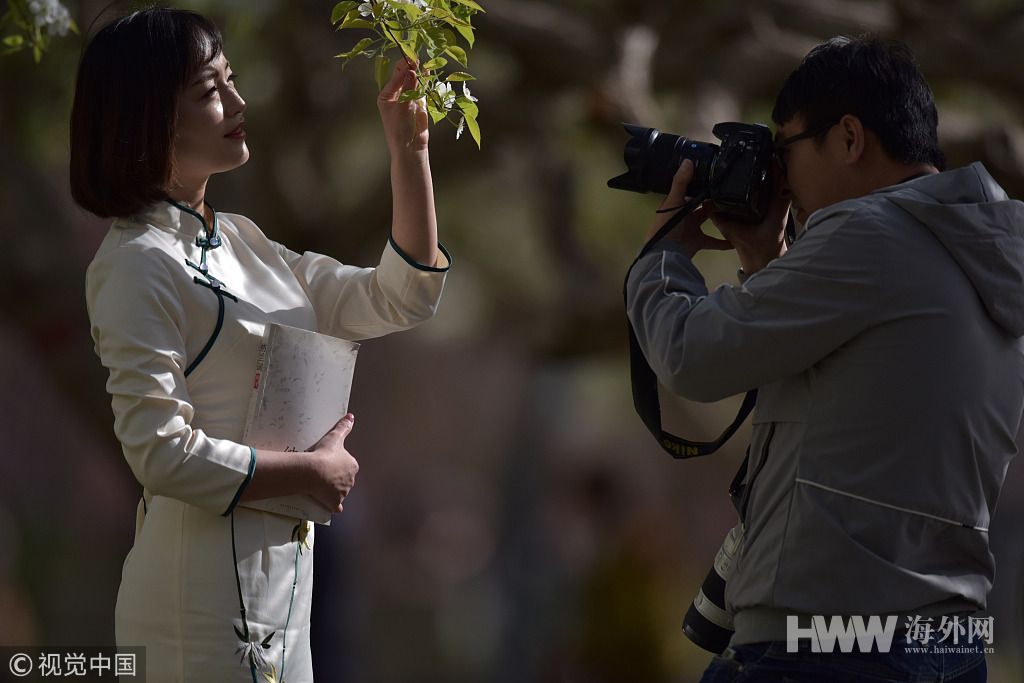 2019年4月9日,摄影爱好者在新疆库尔勒狮子桥头的梨香园拍照游玩。