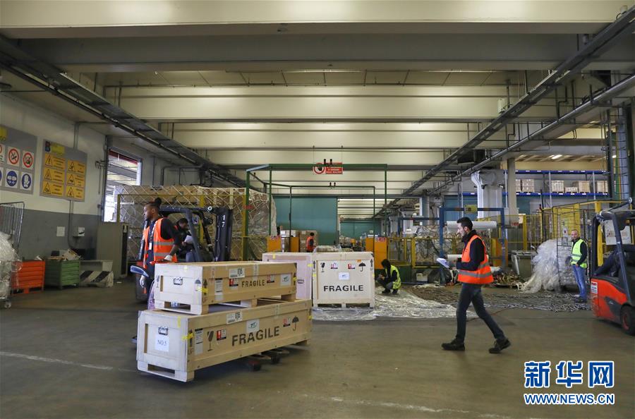 4月8日,在意大利米兰马尔彭萨机场,工作人员准备将打包好的中国流失文物艺术品按规格装到集装板上,为中国流失文物艺术品上机作准备。  新华社记者 程婷婷 摄