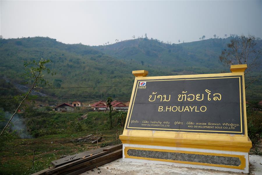 这是3月27日在老挝琅勃拉邦省巴乌县的南欧江一级水电站附近惠楼新村拍摄的村口的村牌。新华社记者王婧嫱摄