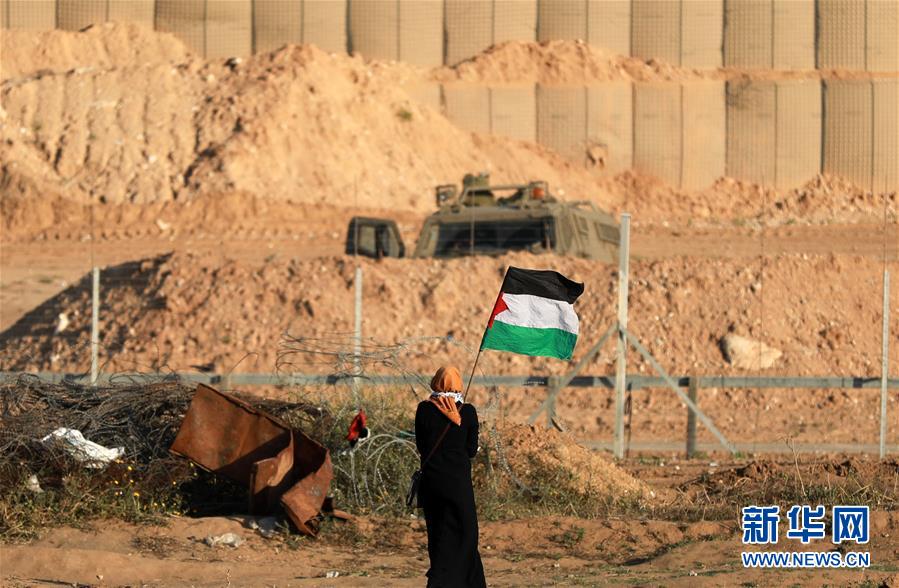 4月12日,在加沙地带中部布赖杰难民营以东,一名巴勒斯坦妇女手持巴勒斯坦旗帜示威。 巴勒斯坦民众12日在加沙地带与以色列交界地区举行“回归大游行”示威活动,并与以军士兵发生冲突。一名巴勒斯坦少年在冲突中被以军士兵开枪打死。 新华社发(亚西尔摄)