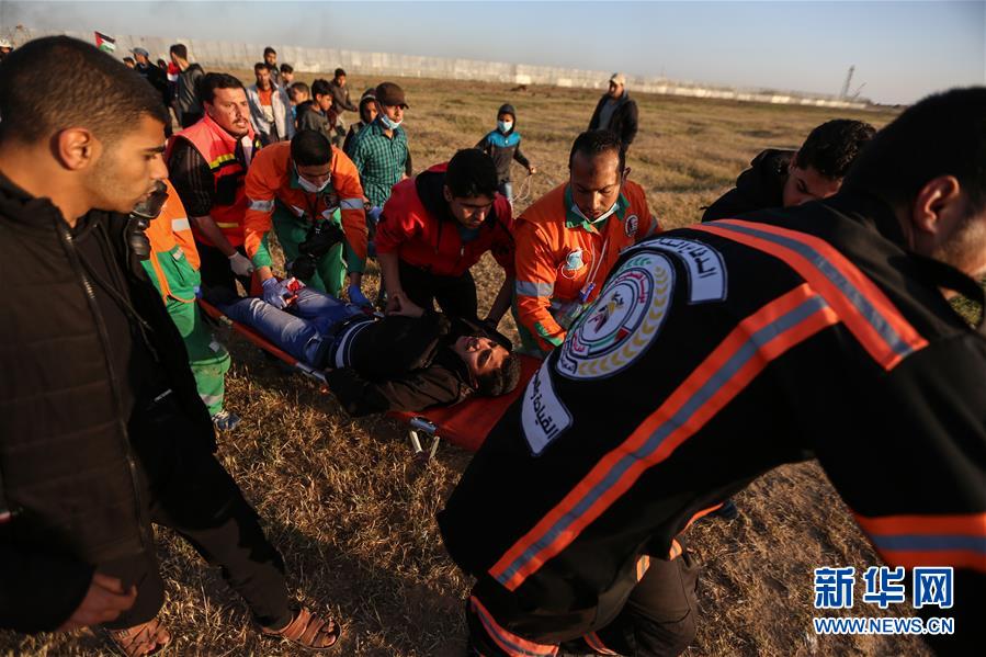 4月12日,在加沙城以东的加沙地带与以色列交界地区,巴勒斯坦医护人员运送一名受伤的示威者。 巴勒斯坦民众12日在加沙地带与以色列交界地区举行“回归大游行”示威活动,并与以军士兵发生冲突。一名巴勒斯坦少年在冲突中被以军士兵开枪打死。 新华社发