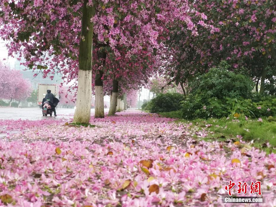 4月14日,一场大雨降临广西柳州市,27万株绽放的紫荆花伴随着雨点飘落,好似“紫荆花雨”一般。道路上铺满的紫荆花与树上的粉红相映成趣,停放在紫荆树下的车辆,被花瓣装点得犹如“花车”。