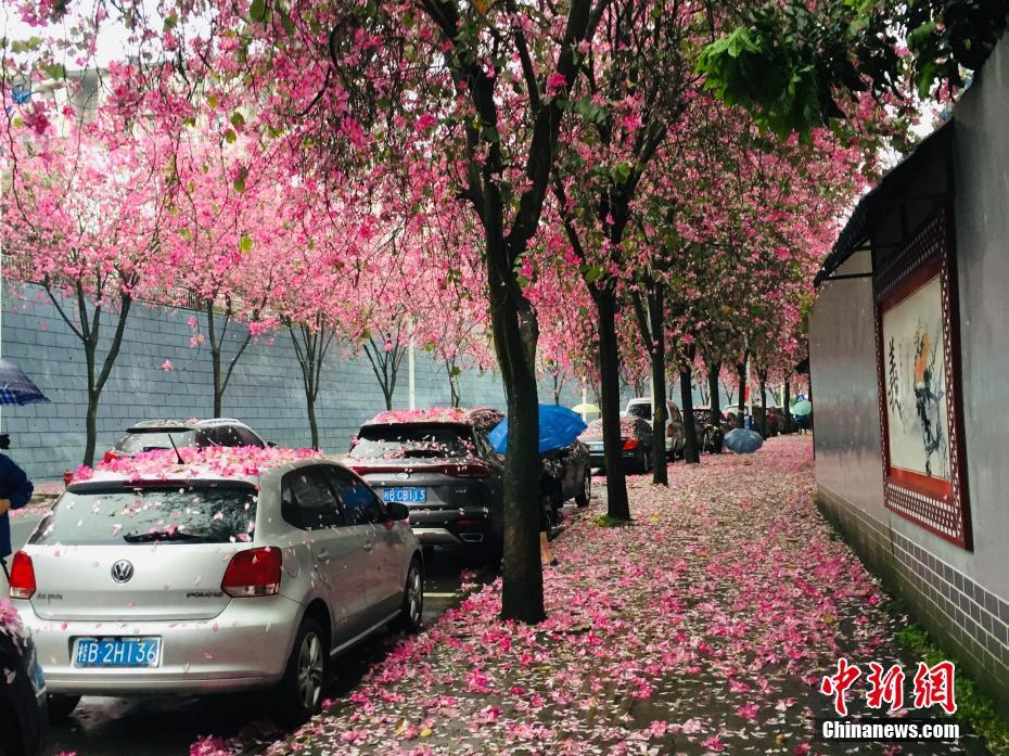 4月14日,一场大雨降临广西柳州市,27万株绽放的紫荆花伴随着雨点飘落,好似“紫荆花雨”一般。道路上铺满的紫荆花与树上的粉红相映成趣,停放在紫荆树下的车辆,被花瓣装点得犹如“花车”。