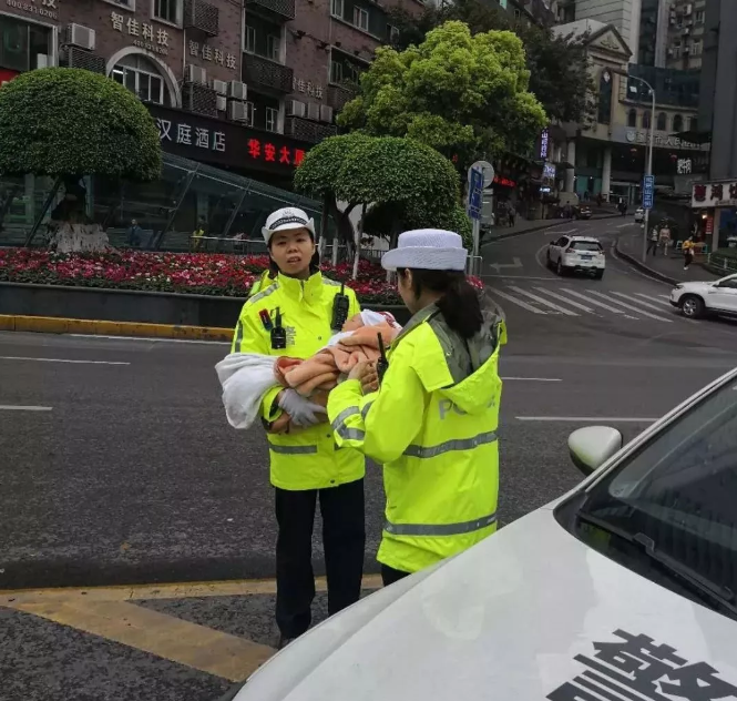 3分钟后,两人开着警车来到了飞来寺路口。90后的女民警陈应洋立即上前去接过婴儿。