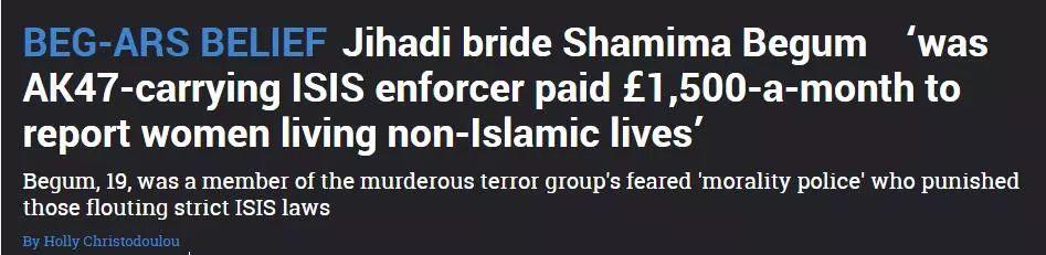 情报机构透露向英国媒体透露,贝居姆不是如她自己所说的那样是一个平民。而是带着AK47扫街的ISIS “执法人员”。靠着举报那些生活举止不符合“伊斯兰教规定”的女性,每月收入1500英镑。