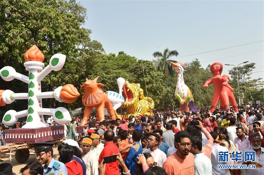 4月14日,民众推着彩车参加孟历新年游行活动。 当日,孟加拉国迎来孟历新年,首都达卡举行节日游行。 新华社发(萨利姆·礼萨 摄)
