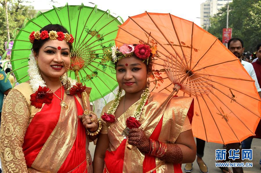 4月14日,人们身着盛装参加节日游行活动。 当日,孟加拉国迎来孟历新年,首都达卡举行节日游行。 新华社发(萨利姆·礼萨 摄)