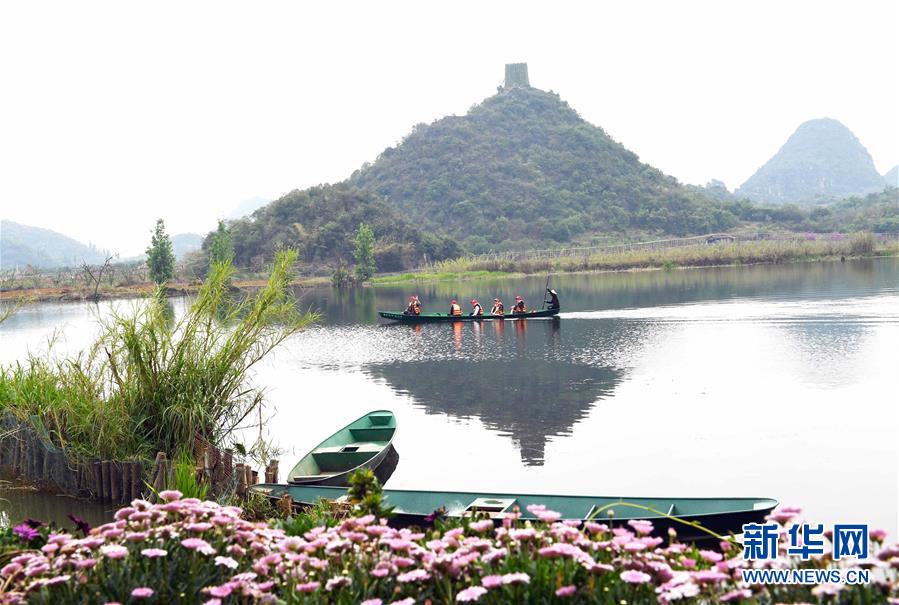 4月14日,游人在普者黑国家湿地公园荡舟观景。 位于云南省文山壮族苗族自治州丘北县的普者黑国家湿地公园山水秀丽、风景如画,吸引人们前来休闲度假。 新华社记者杨宗友摄