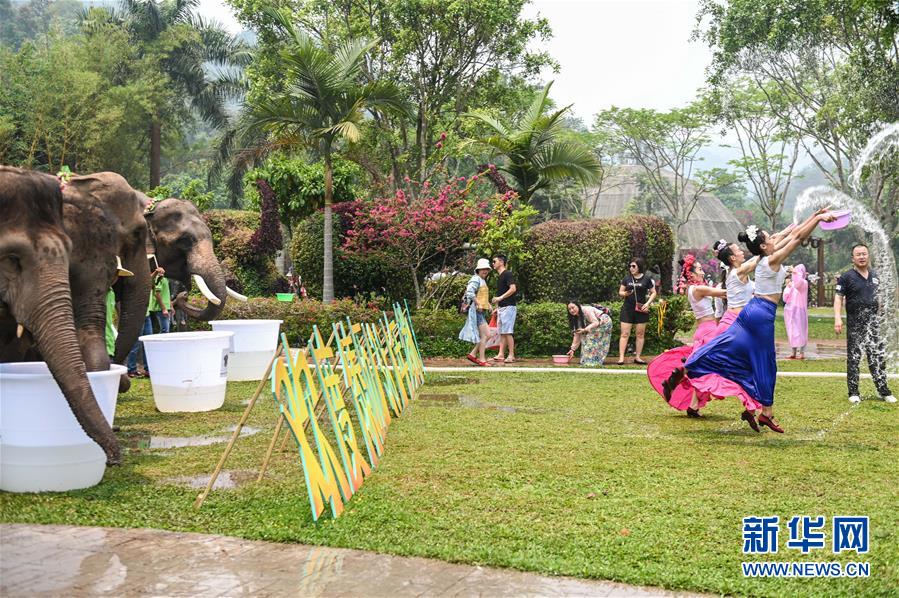 4月14日,在位于云南省西双版纳傣族自治州的野象谷景区,游客参加泼水节活动,庆祝傣历新年。 泼水节于每年4月中旬举行,是泰国、柬埔寨和缅甸等东南亚国家和我国云南、广西等地的传统节日活动。人们用相互泼水的方式互送祝福、传递欢乐。
