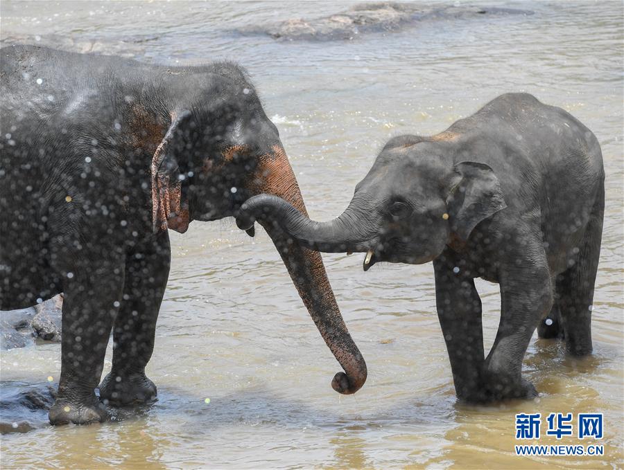 在斯里兰卡平纳维拉,两头大象在河水中互相打招呼。新华社记者 郭磊 摄