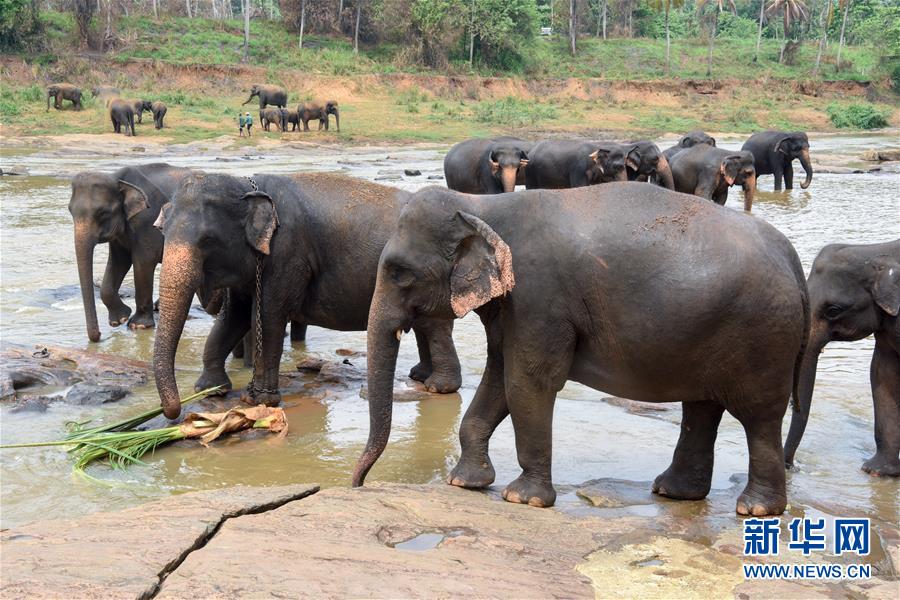 在斯里兰卡平纳维拉,大象一边啃着芭蕉叶,一边惬意享受洗浴时光。这些大象来自约100多米外的大象孤儿院。新华社记者 郭磊 摄