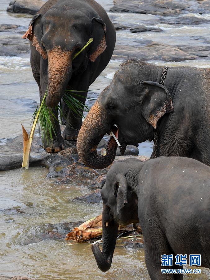 在斯里兰卡平纳维拉,大象一边啃着芭蕉叶,一边惬意享受洗浴时光。新华社记者 郭磊 摄