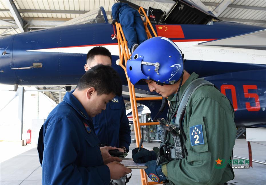 4月10日,飞行员张春雷安全顺利完成飞行架次后与地面工作人员交接飞机。柳军 摄 图片来源:中国军网