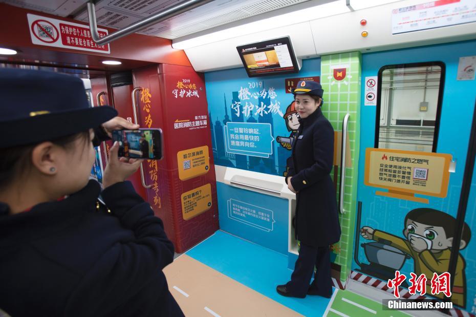 4月17日,乘客乘坐消防主题地铁列车。当日,哈尔滨市举行“4.17消防宣传活动暨地铁消防主题列车启动仪式”。据了解,消防主题地铁列车共6节车厢,每节车厢一个主题,通过生动的动漫形象,向民众普及消防知识。中新社记者 吕品 摄
