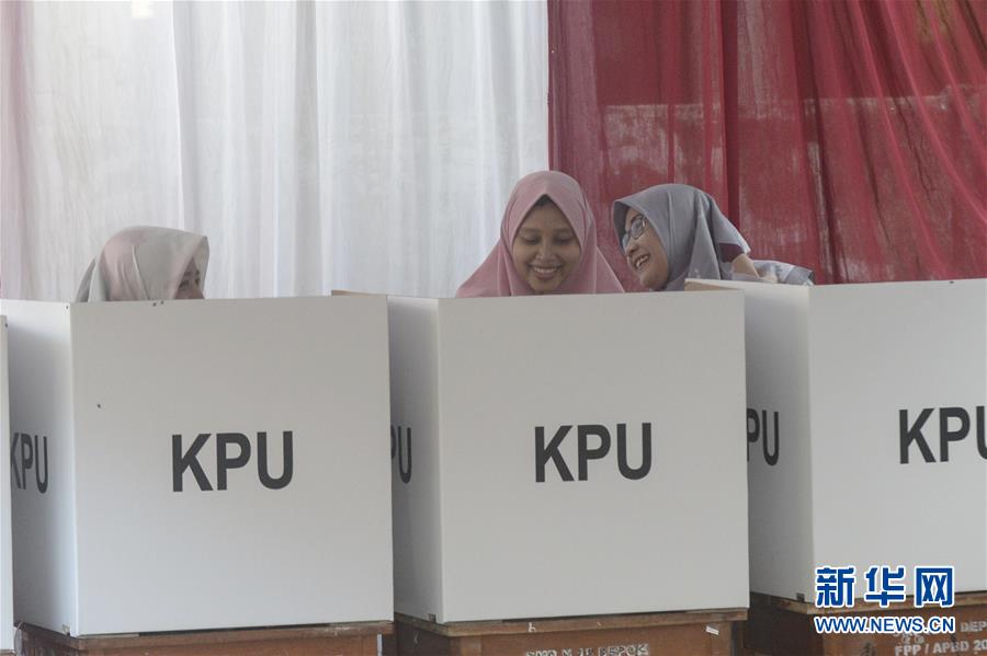 4月17日,选民在印度尼西亚南唐格朗一处投票站投票。 印度尼西亚17日举行总统选举投票,印尼1.9亿注册选民将前往全国80多万个投票站投票,选出新一届总统和副总统。 新华社发(阿贡摄)
