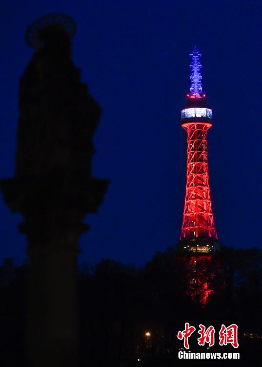当地时间4月16日,多国建筑点亮法国国旗色,表达对巴黎圣母院大火的震惊惋惜。图为捷克布拉格,佩特任瞭望塔点亮法国国旗色,哀悼巴黎圣母院大火。图片来源:东方IC 版权作品 请勿转载