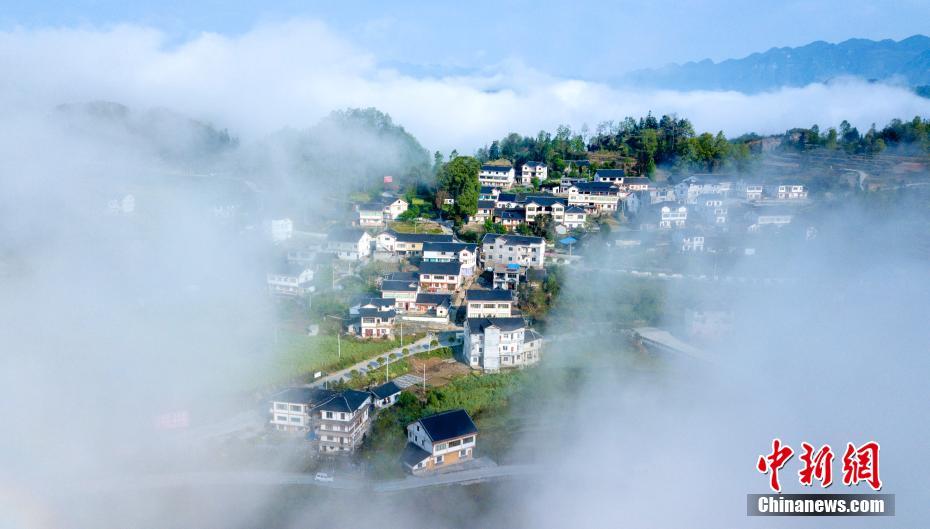 4月17日,贵州省务川仡佬族苗族自治县红丝乡先进村,云雾、村庄与青山交相辉映,在晨曦照射下,空中俯瞰云遮雾绕的乡村,形成一幅梦幻山村图,宛若仙境。