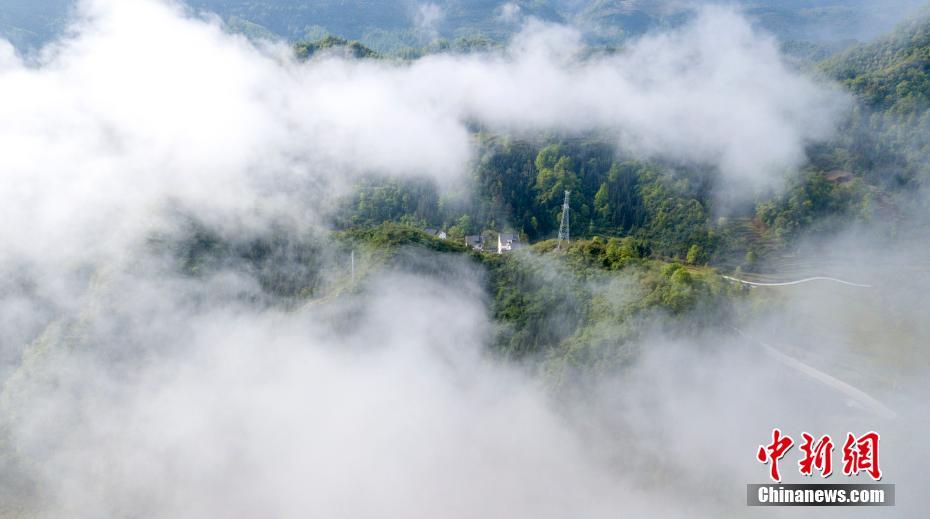 4月17日,贵州省务川仡佬族苗族自治县红丝乡先进村,云雾、村庄与青山交相辉映,在晨曦照射下,空中俯瞰云遮雾绕的乡村,形成一幅梦幻山村图,宛若仙境。