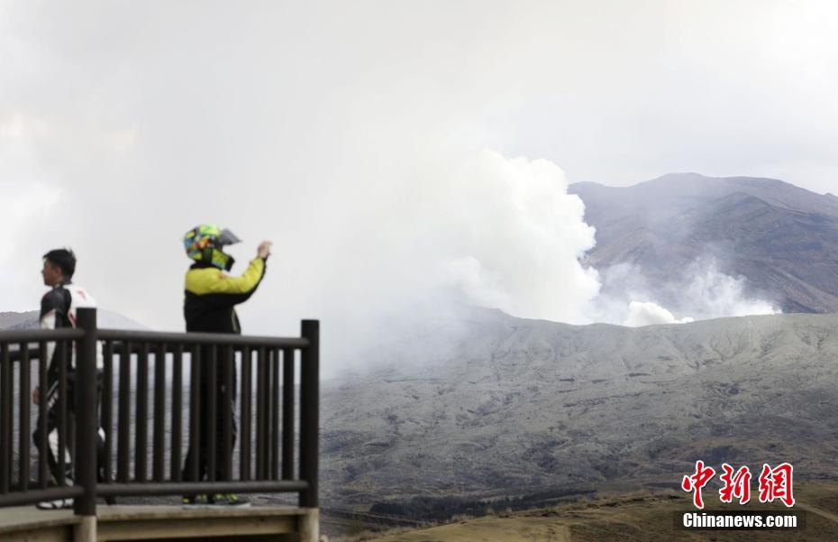 日本熊本县阿苏山火山喷发 游客远眺浓烟四散