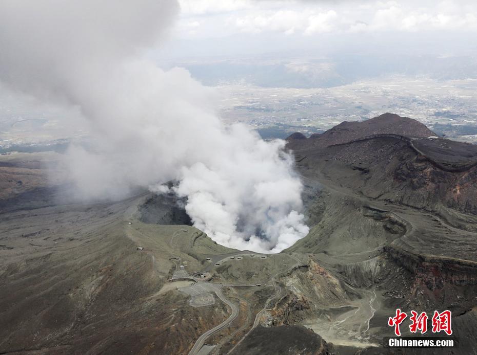 日本熊本县阿苏山火山喷发 游客远眺浓烟四散
