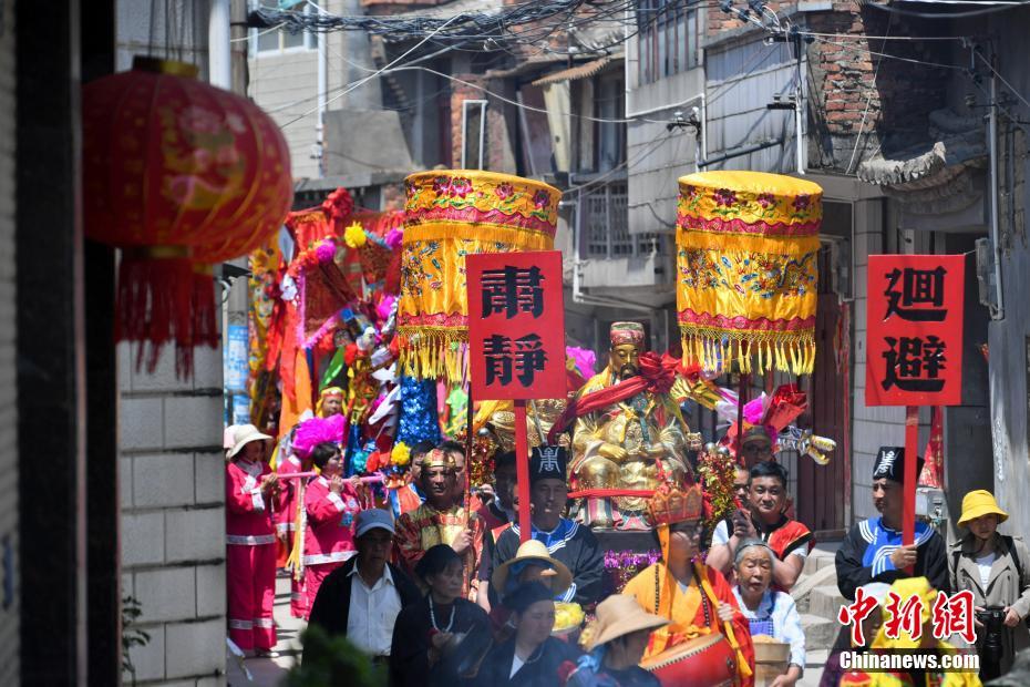 4月17日,民众抬着“城隍”和“土主”塑像巡游。当日,昆明市晋宁区古城村举行传统“米线节”,当地民众敲锣打鼓,抬着“城隍”和“土主”塑像围村庄巡游。据了解,农历三月十三“米线节”是当地传统民俗节日。中新社记者 任东 摄