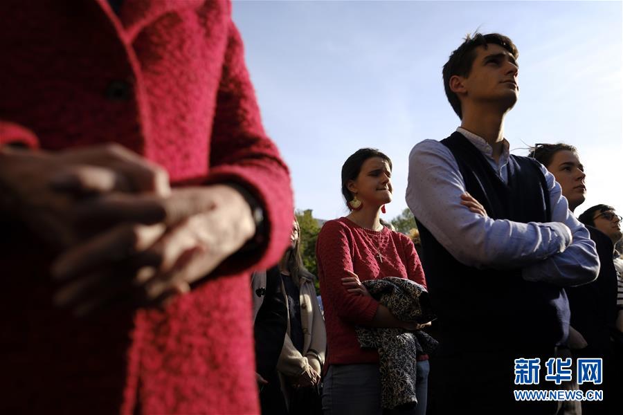 4月17日,在法国巴黎,人们聚集在一起为巴黎圣母院祈福。 法国负责调查巴黎圣母院大火的检察官雷米·海茨17日说,目前火灾原因主要指向“事故因素”。初步调查显示,倒塌的塔尖下方可能是最初的起火点。巴黎圣母院15日突发火灾,圣母院的屋顶和塔尖被烧毁,但主体建筑得以保存。 新华社发(亚历山大·卡曼摄)