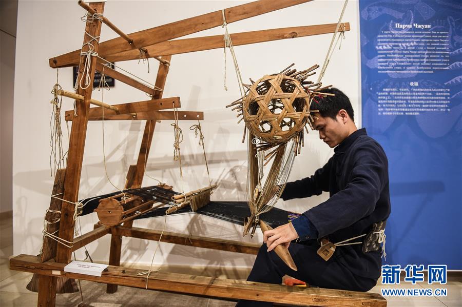 4月16日,在俄罗斯首都莫斯科,工作人员在中国丝绸服装展上现场演示。 新华社发(叶甫盖尼·西尼岑摄)