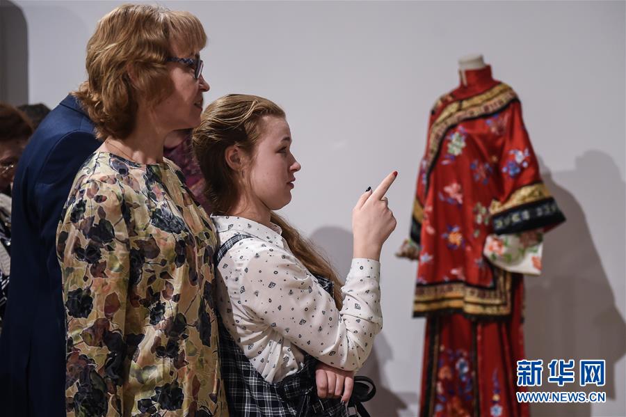 4月16日,在俄罗斯首都莫斯科,观众参观中国丝绸服装展。 新华社发(叶甫盖尼·西尼岑摄)