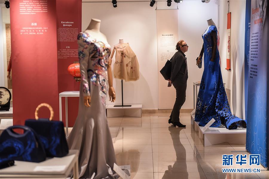 4月16日,在俄罗斯首都莫斯科,一名观众参观中国丝绸服装展。以“丝·尚”为主题的中国丝绸服装展16日晚在俄罗斯莫斯科中国文化中心开幕,参展的30件丝绸服装色彩华丽、工艺精细,让到场参观的当地民众深为叹服。新华社发(叶甫盖尼·西尼岑摄)