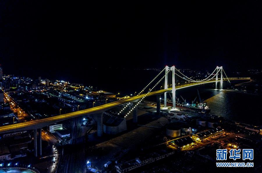 这是4月9日在莫桑比克拍摄的马普托大桥夜景(无人机拍摄)。