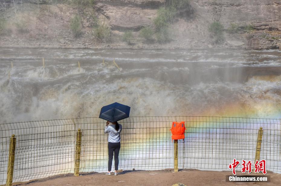 4月18日,山西临汾吉县,黄河壶口瀑布上方出现一道彩虹,“彩虹通天”跨越秦晋两省,吸引游客在壶口瀑布前留影。