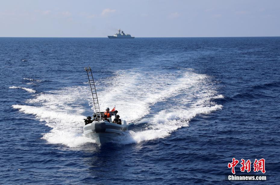 近日,海军第32批护航编队在前往亚丁湾、索马里海域途中,组织开展舰机协同、直升机滑降、小艇攀爬、舱室搜索等护航针对性训练,进一步巩固提升官兵护航核心能力。图为特战队员进行小艇攀爬训练。
