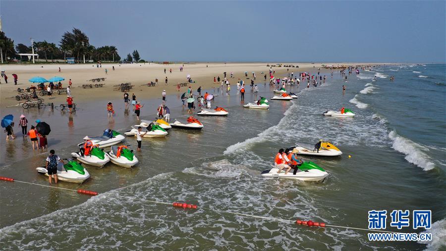 4月18日,游客在北海银滩游玩。 近日,随着气温回升,众多游客来到广西北海银滩旅游,享受碧海蓝天带来的乐趣。 新华社记者 张爱林 摄