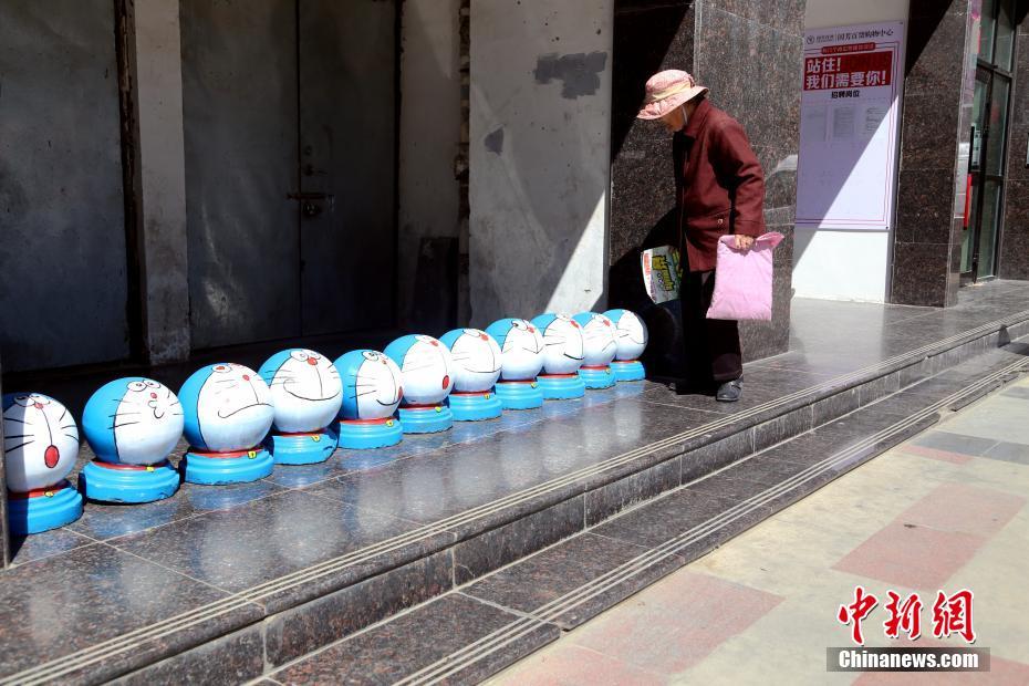 4月18日,路人被创意石墩吸引。近日,西宁一商业区内的隔离石墩被美化成了一个个呆萌可爱的海绵宝宝、哆啦A梦、钢铁侠等动漫人物形象,创意十足。中新社记者 马铭言 摄