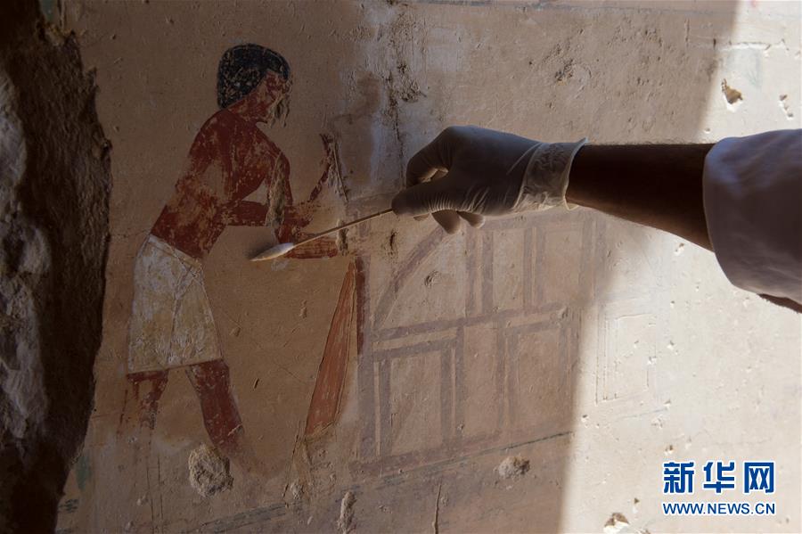 4月18日,在埃及南部卢克索省,考古人员在古埃及王室成员墓葬现场工作。新华社记者 孟涛 摄