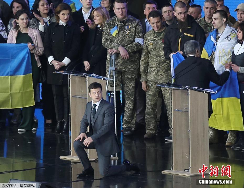 乌克兰大选辩论 泽连斯基邀波罗申科一同下跪