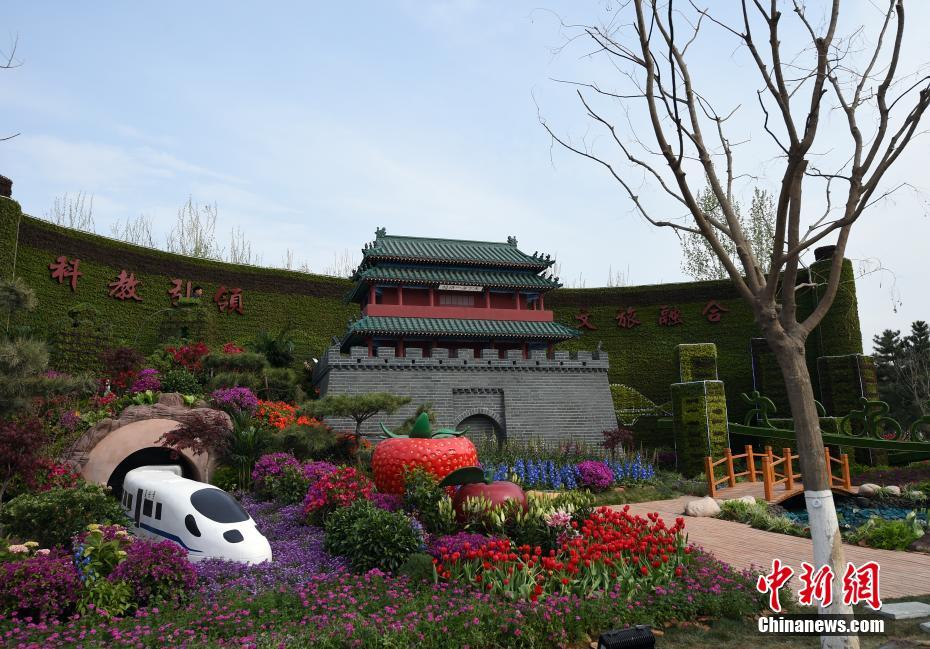 4月19日,北京世园会园区内的城楼与高铁景观。2019年中国北京世界园艺博览会(简称北京世园会)将于4月29日至10月7日在北京延庆举行。本届世园会将有约110个国家和国际组织、120多个非官方参展方参展。中新社记者 侯宇 摄