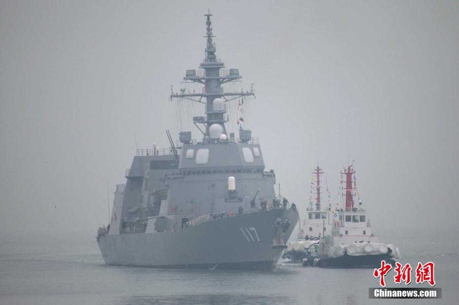 4月21日,参加中国人民解放军海军成立70周年多国海军活动的外国舰艇陆续抵达中国青岛。图为日本海上自卫队“凉月”号驱逐舰。 中新社记者 李纯 摄