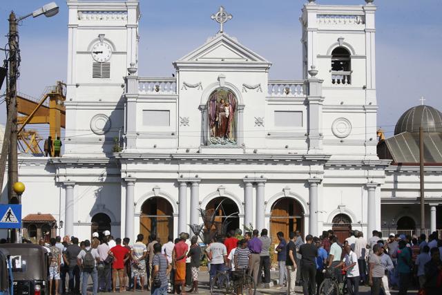 当地时间4月22日,斯里兰卡系列爆炸第二天,圣安东尼教堂外守卫森严,斯里兰卡空军军官和神职人员在教堂外查看情况,不少市民在警戒线外围观。东方IC 图