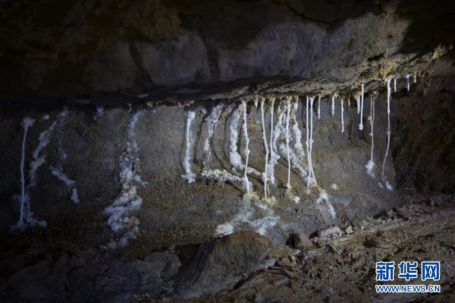 4月14日,在位于死海南端的以色列迈勒海姆盐洞内,来自以色列洞穴探索俱乐部的约阿夫·内盖夫(左)介绍盐洞情况。 以色列洞穴研究专家近日宣布,他们与来自其他国家的洞穴探索者合作勘查发现,位于死海地区的以色列迈勒海姆洞长10公里,是世界上最长的盐洞。这个盐洞最初由以色列希伯来大学洞穴研究中心专家上世纪80年代在绵延11公里的塞多姆山里发现。塞多姆山位于死海西南端,比海平面低170米。山体几乎全部由盐构成,只覆盖薄薄一层岩石。每年冬季,雨水渗入山石缝隙,溶解盐分,不断形成新的洞穴。 新华社记者 郭昱 摄