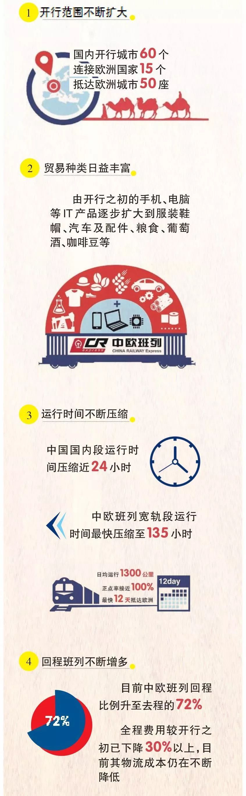 作为推动中国制造走出去的“新引擎”,中欧班列给我国内陆城市进出口贸易打开了一条新通道,自2011年开行以来一直保持着快速的增长势头。更值得关注的是,中欧班列返程班列比例稳步提升,2018年上半年同比增长100%,目前回程比例升至去程的72%。初步实现了重车去重车回。这些数据让我们看到中欧班列利用铁路运输的比较优势将内陆城市推向全球贸易的舞台中心。