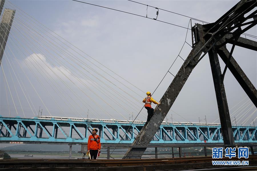 中国铁路成都局有限公司重庆工务段的两名桥隧工在重庆白沙沱长江大桥进行巡检作业(4月23日摄)。 4月23日下午5点40分,随着重庆白沙沱长江大桥通行的最后一列客运列车顺利通过,这座“服役”了59年的重庆首座长江大桥进入“退役”倒计时。4月24日后,所有列车将改线经距白沙沱长江大桥约100米的新白沙沱长江特大桥通行,新桥“接力”老桥,运输能力将得到大幅提升。 白沙沱长江大桥于1958年开工,1960年通过首趟列车,是继武汉长江大桥之后的第二座长江大桥。 新华社记者 刘潺 摄
