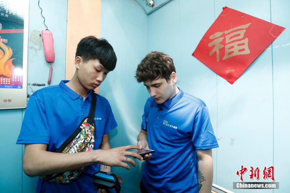 4月23日,俄罗斯留学生尤瑞在北京体验快递员的工作与生活。中新社记者 韩海丹 摄