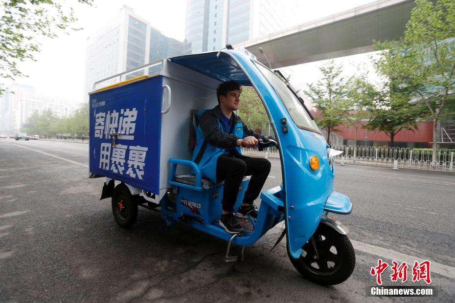 4月23日,俄罗斯留学生尤瑞在北京体验快递员的工作与生活。中新社记者 韩海丹 摄
