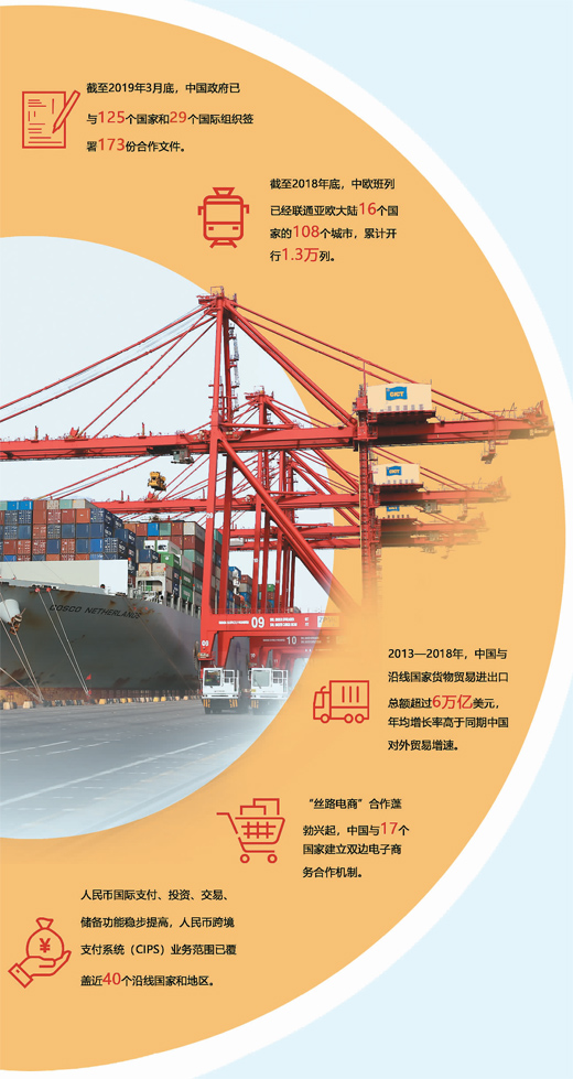在设施联通方面,中国与“一带一路”沿线国家开展了多领域的基建互联互通合作,涉及铁路、港口、航空运输和电网等。中老铁路进展顺利,中泰铁路一期工程合作推进,雅万高铁22处重点工程已实现开工,匈塞铁路塞尔维亚境内贝旧段开工建设。截至2018年底,中欧班列已经联通亚欧大陆16个国家的108个城市,累计开行1.3万列。“设施联通在‘一带一路’建设推进过程中发挥着促进地区经济发展、融合的基础作用。”中国社科院西亚非洲研究所研究员杨光表示,这体现了“要想富、先修路”的中国智慧。