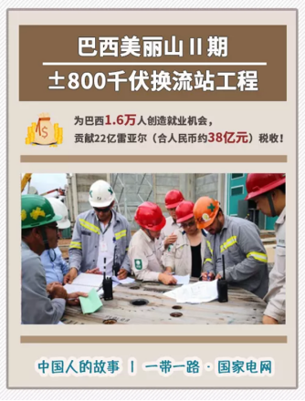 2014年7月,在习近平主席与时任巴西总统罗塞夫的共同见证下,国家电网公司与巴西国家电力公司签署了《巴西美丽山特高压输电项目合作协议》。工程将带动巴西当地电源、电工装备、原材料等上下游产业升级,提升巴西电力资源合理利用率,还将为巴西当地1.6万人创造直接就业机会,真正实现中巴双方互利互惠、合作共赢。