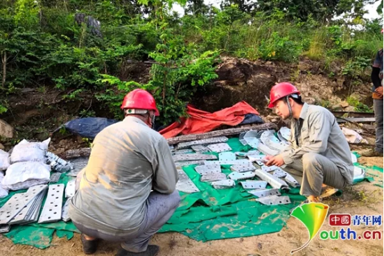 2019年,张龙飞(右)在缅甸北克钦邦230千伏主干网连通工程输电线路上进行铁塔塔材开包检查。资料图